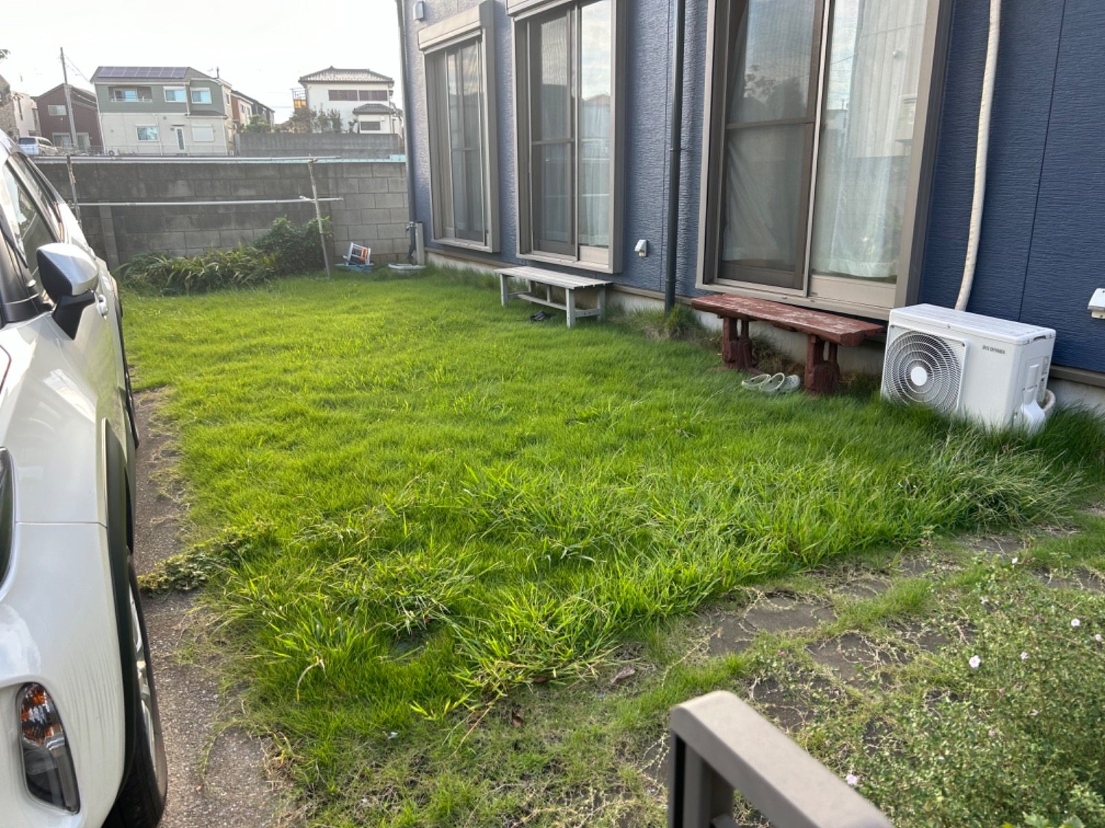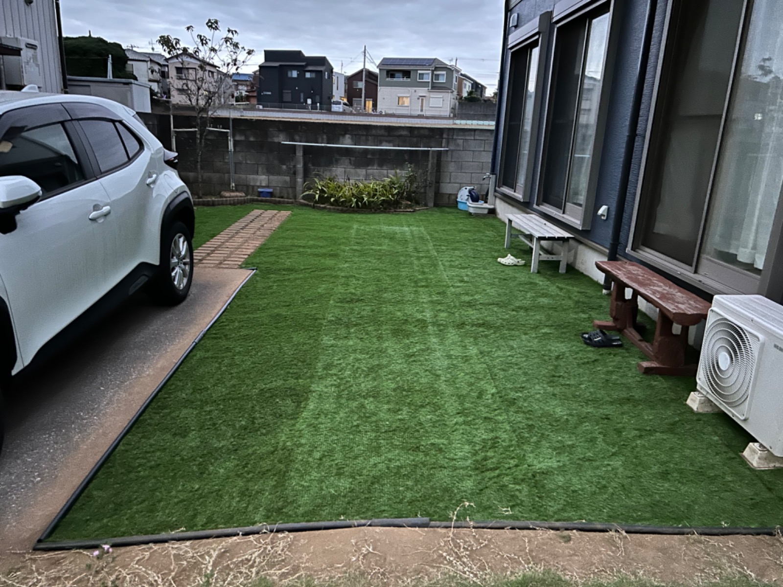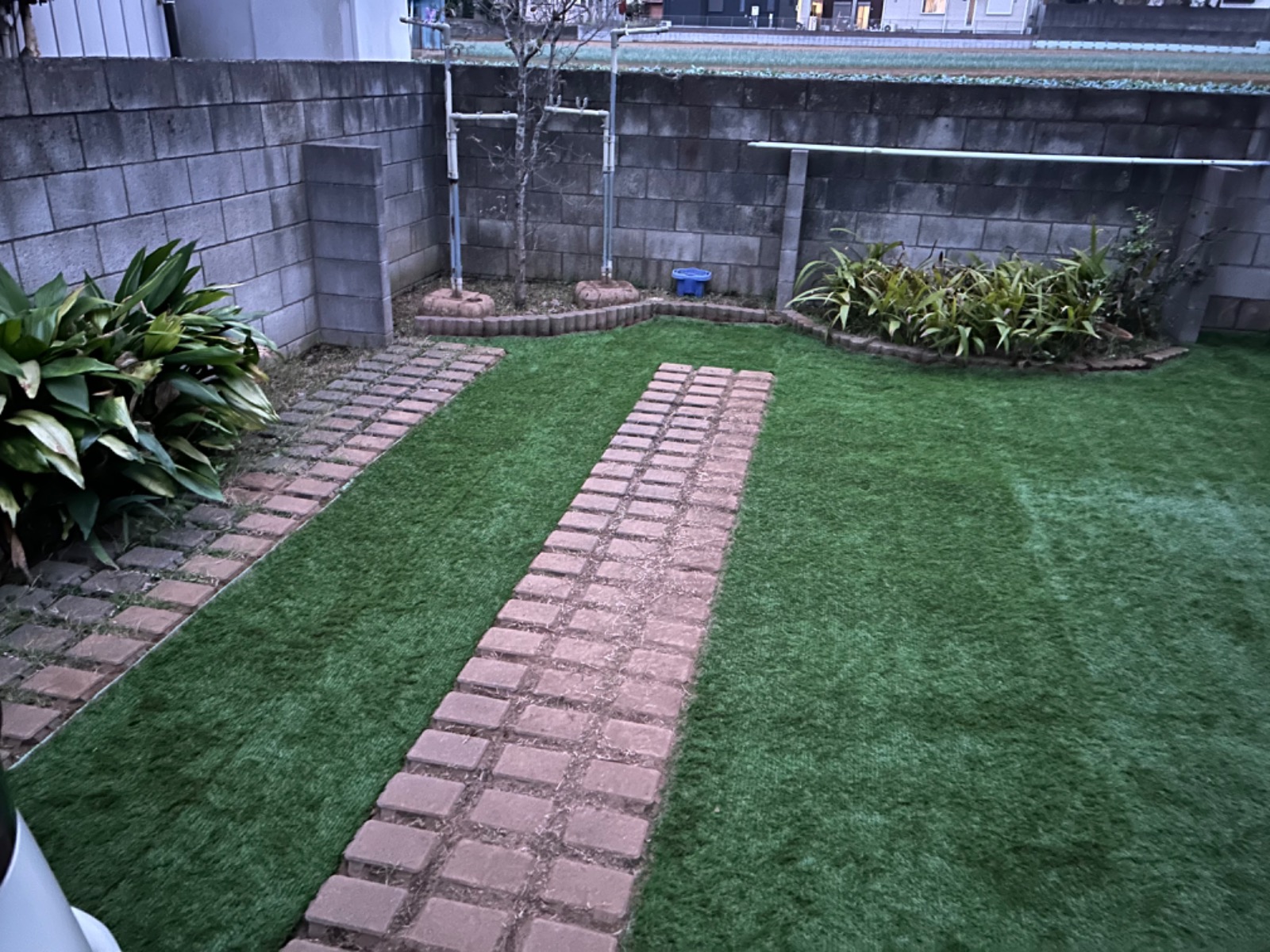 | 工事内容 | ◎天然芝から人工芝へ変更 ・既存芝撤去 ・転圧のうえ整地 ・除草剤散布 ・防草シートを敷いたうえ人工芝敷設 |